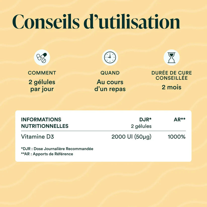 Comme il peut être difficile de combler ses apports en vitamine D3 par la seule exposition au soleil (notamment en hiver ou en période de mi-saison), prendre un complément de vitamine D aide à prévenir toute carence.